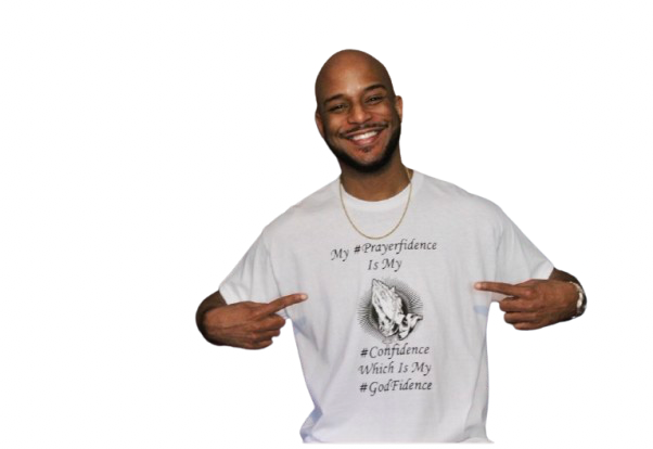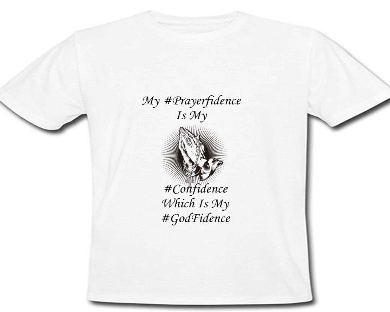 This t-shirt design features a powerful message about finding confidence through one's faith in God. The central text reads "My #Prayerfidence Is My #Confidence Which Is My #GodFidence", conveying the idea that true confidence comes from a deep spiritual connection and trust in God.